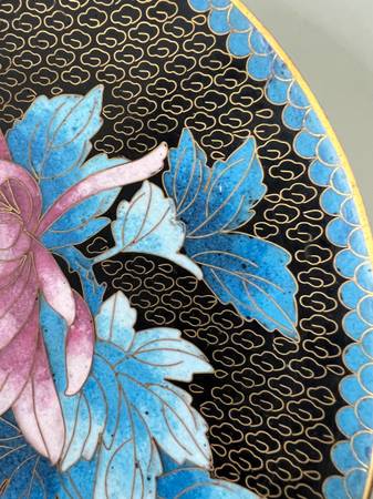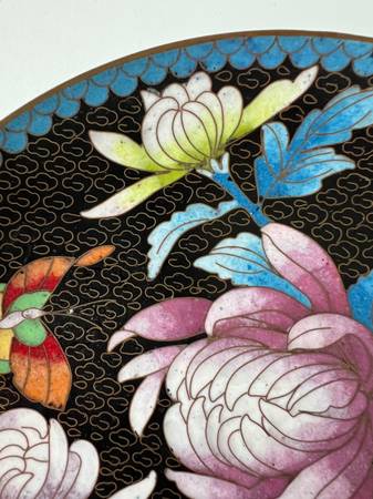 Lovely and detailed Cloisonné plate - colorful with flowers and a butterfly. In excellent condition - rim on the base has a small indent but this does not impact the stability off this item- see photo of backside
