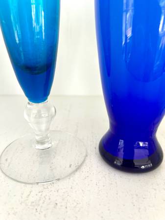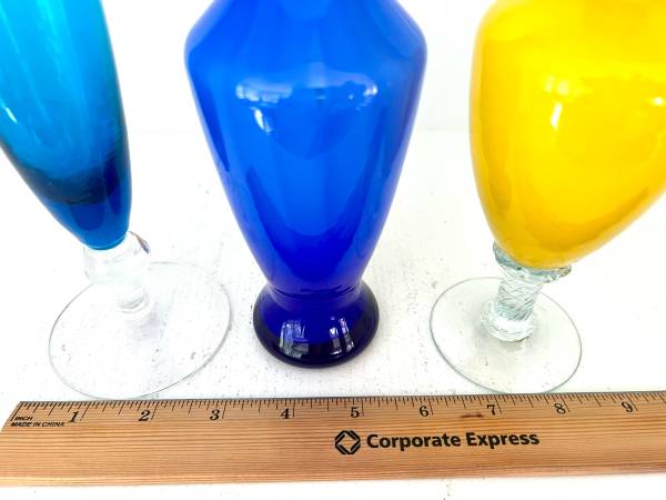 These area just fun bud vases especially when they are grouped together Take all 3 for $20 (discounted) or buy just one for $10. Each in excellent condition Note the colbolt blue vase looks like it...