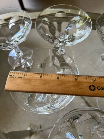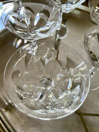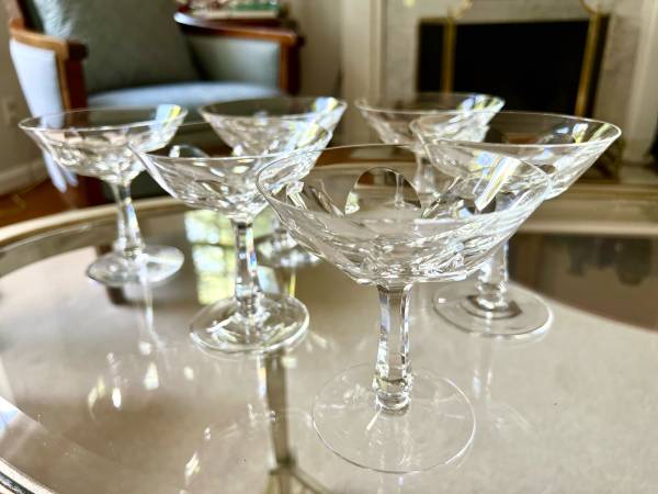 Stunning set of crystal glasses that have vintage elegance. This is a set of 6 glasses in perfect condition. There are 2 extra glasses than you can also have which match this set but these each have a very tiny fleabite on the rim - still quite usable but not perfect