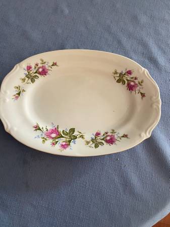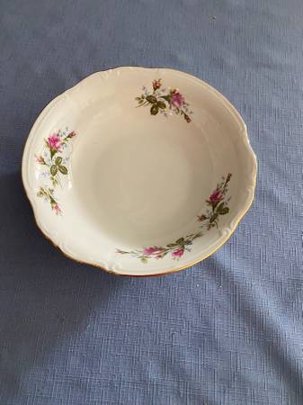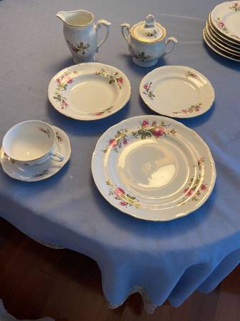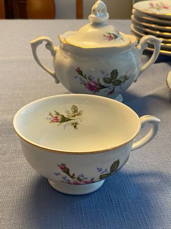 7 dinner plates 8 desert/salad plates 8 soup bowls 8 saucers 7 cups 1 creamer and 1 sugar bowl 1 serving platter 1 serving bowl Excellent condition Cash only. Pickup. Prefer to sell as a set.