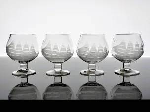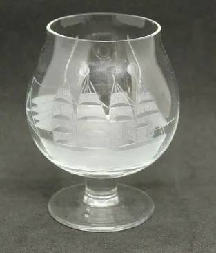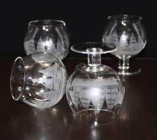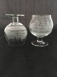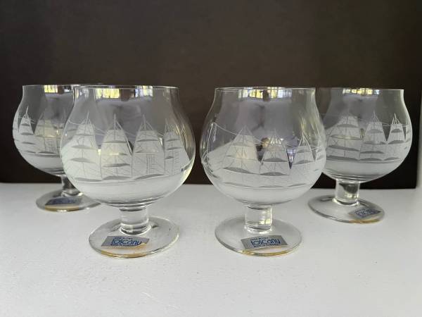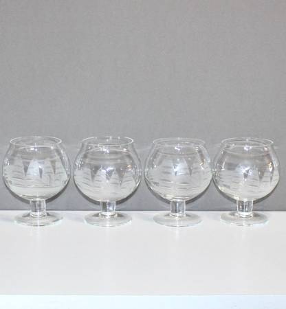 Beautiful vintage brandy snifter glasses with a clipper ship design etched into the glass by Toscany of Romania. Each measures 4 1/4 inches tall by approx 2 5/8 inches at the rim. No chips or cracks. Each has original labels. A great gift for the brandy expert in your life.