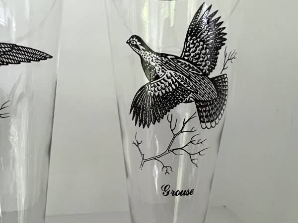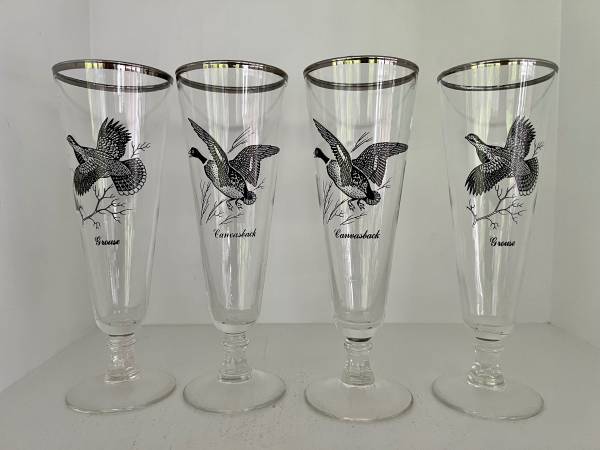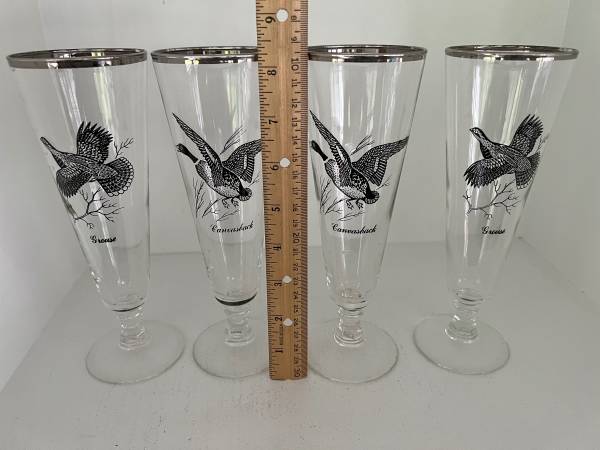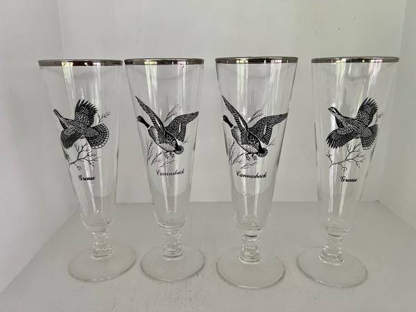 4 vintage Pilsner glasses from the 1960’s Each in pristine condition 3 different birds featured ( one bird is on two of the glasses ) Note -as these are silver or platinum trim these are hand wash...