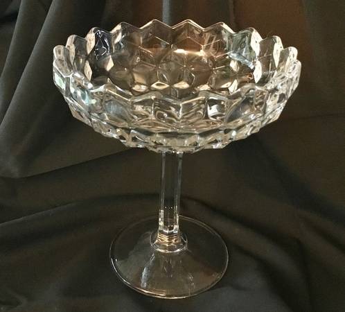 The beautiful Fostoria Glass Company Crystal "American" Pattern Compote or Candy Dish was made between 1915 and 1983 as confirmed by the pattern production dates. this pattern is specific to Fostoria Glass Company. The compote which measures 6.25" tall with a 5.25" diameter opening and a 3.5" tall hexagonal stem and 3.5" diameter base is in very good condition with no scratches, chips, or cracks.