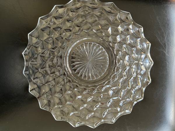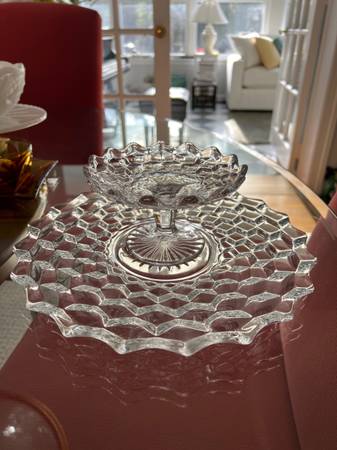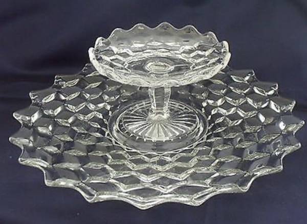 This is a rare set designed so that both the 12” plate and the low compote can be used separately or together The compote fits perfectly into the center of the plate too