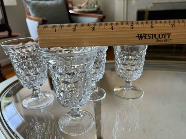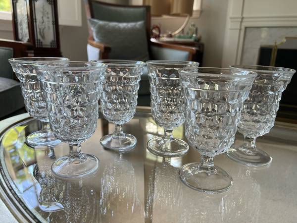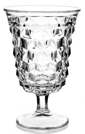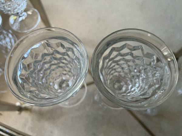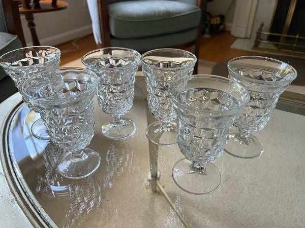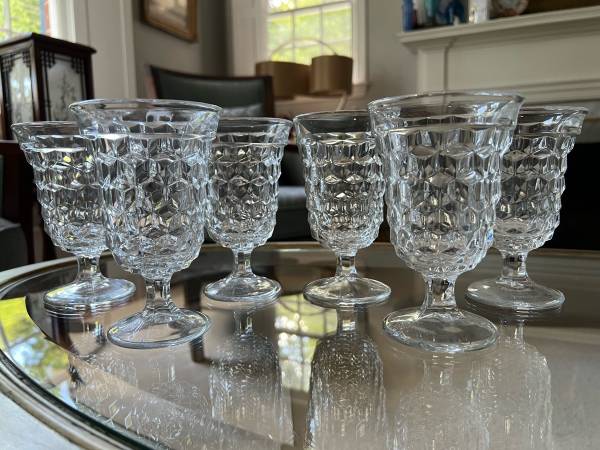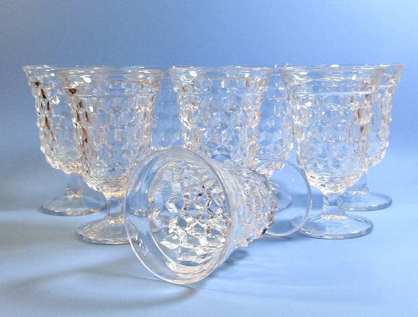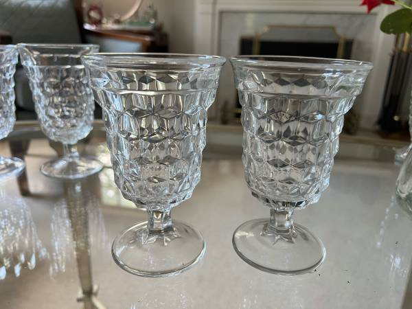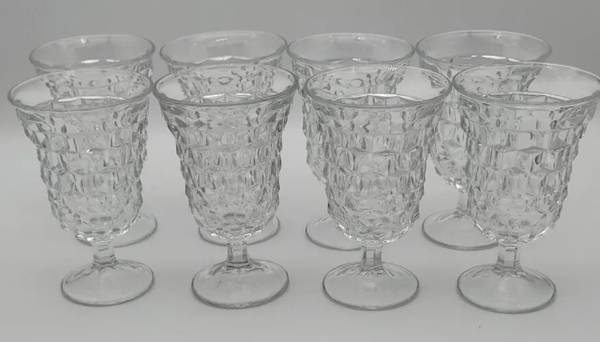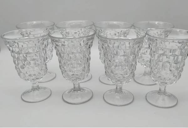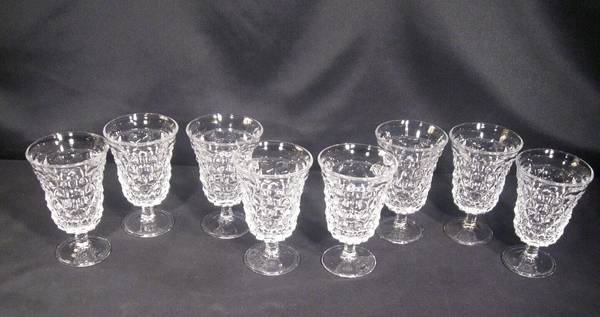 Set of 8 Fostoria American stemmed low water glasses. Art deco Cube design. Sturdy, durable, elegant crystal glasses that can be used at the table for water, as everyday glasses or as cocktail glasses. One of the most popular US glassware patterns ever made. vintage collectible. Each glass on like new condition