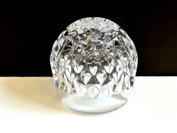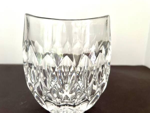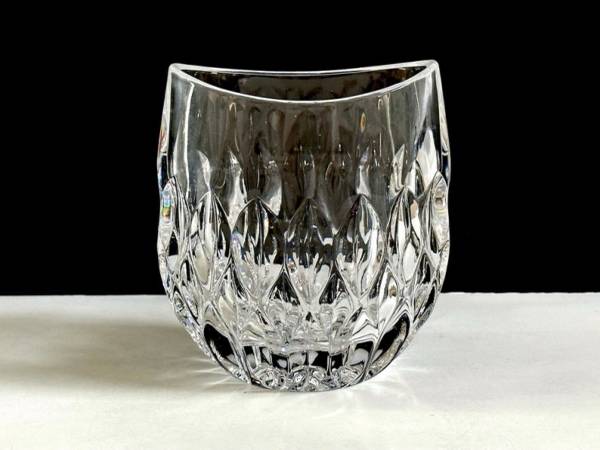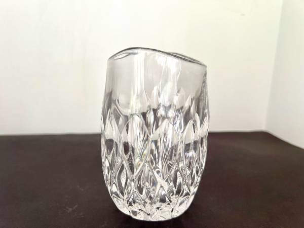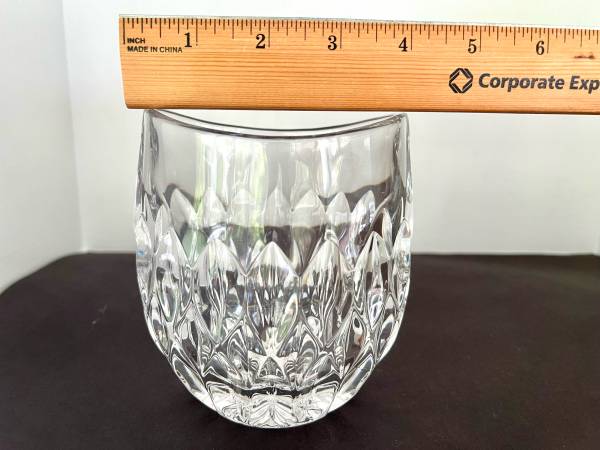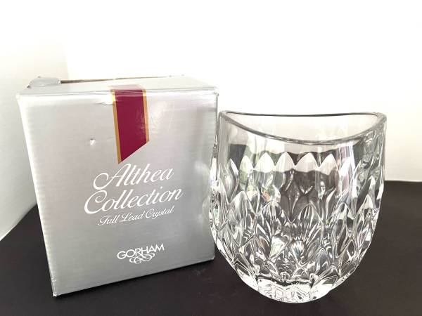 Lovely and unique shaped crystal 5" vase was made by Gorham and is the Althea pattern. It measures 5" high and 4" wide and 2¾" depth. This oval shape vase features vertical cuts around the vase and bottom. Makes a wonderful crystal gift or keep for yourself. In excellent like new condition without scratches, nicks, chips, cracks or stains. Comes with its original box - box shows some wear