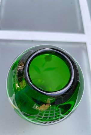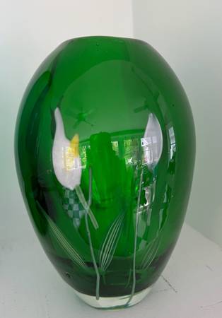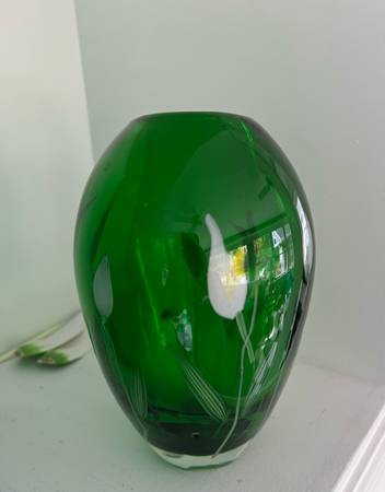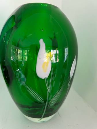 Green Cala Lilies Art Glass Vase. Measures 8" tall. Beautiful green glass with white cala lilies throughout. Bubbles throughout vase including a larger bubble towards the bottom of the vase (see picture)