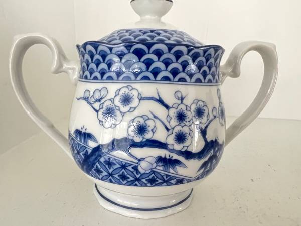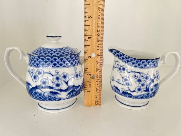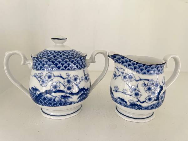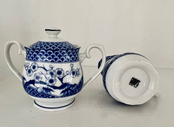 Gumps Oriental Garden blue and white cherry blossoms cream + sugar...