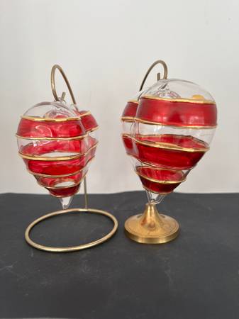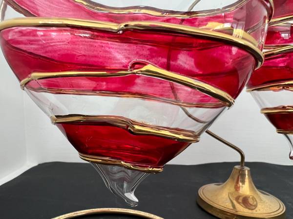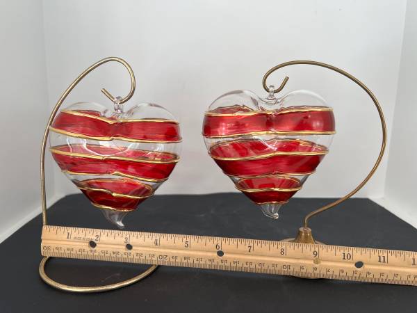 These are 2 large hand blown clear with red and gold overlay venetian glass puffy hearts with stands each 4" wide. Each glass heart in perfect condition. What a lovely and unique valentines present to a couple - having a pair of glass hearts!