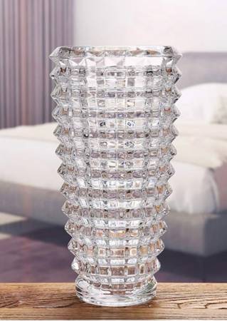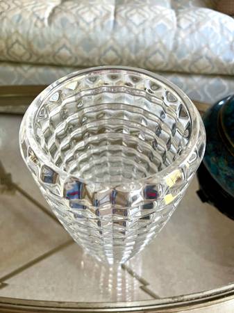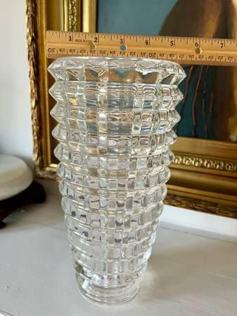 Stunning crystal vase - unmarked. Has a similar look to a baccarat vase. It has a moderately tapered shape and features a symmetric ridged pattern across the exterior adding a bold texture on its front It makes an eye-catching impression.