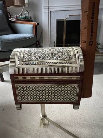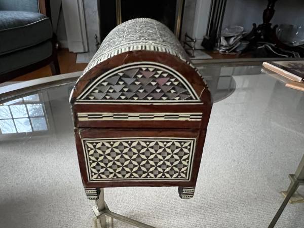 Beautiful hand crafted dome shaped box purchased in Damascus decades ago. In wonderful condition. Red velvet interior. See photos for measurements Pick up in the Seven Corners area of Falls Church,...