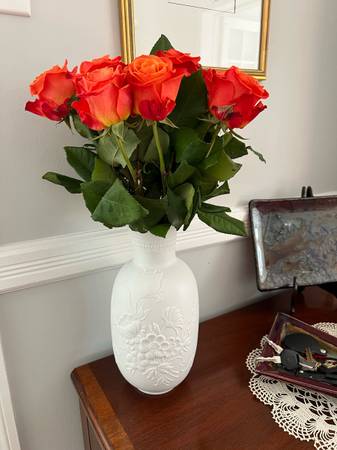 this is a beautiful white bisque porcelain vase by Kaiser of Germany. The vase stands about 10.5 inches tall and is in excellent condition with no damage. The flowers and detailing on this vase is just gorgeous, so don’t miss out on adding it to your decor. Any color flower just looks stunning against this white vase and yet the vase looks magnificent too without flowers