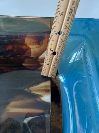 Made using handrolled Bullseye glass. It measures 11"x11"x3" deep and is perfect for any sort of salad or side dish. Hand-wash and then display as a piece of art too! In excellent condition.