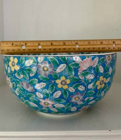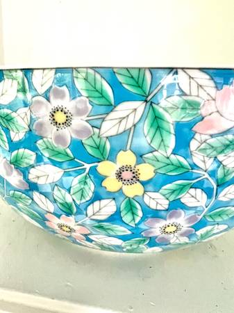 Stunning Large Japanese bowl on beautiful pastel colors in a floral chintz pattern. This has a Summer's day sky blue background with dense cherry blossom pattern. Chinoiserie style decorative porcelain bowl. Made in the 1980s-1990’s