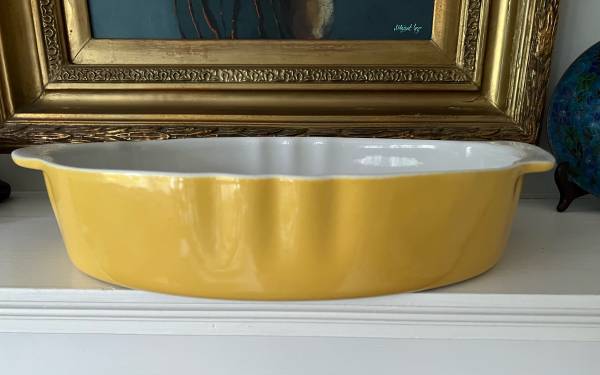Crafted with art pottery production style and impressively finished, this mid-century modern style casserole dish is a vintage piece from 1985. The solid pattern and yellow color of the dish will make it a standout piece in your collection. This oval-shaped casserole dish is heavy and sturdy. Get your hands on this original casserole dish and enjoy its beauty and functionality.
