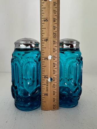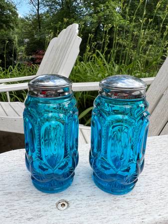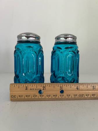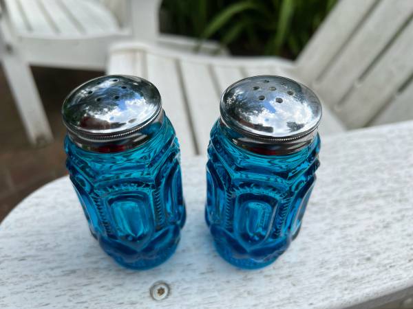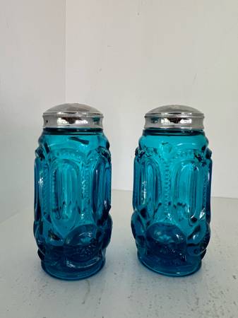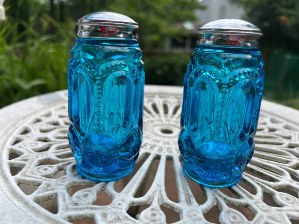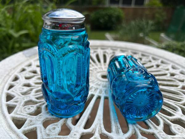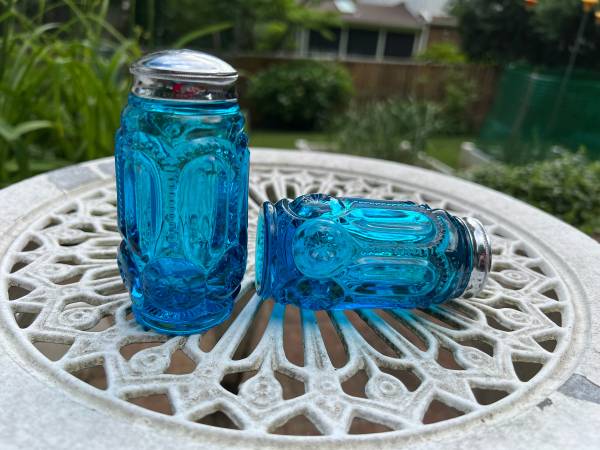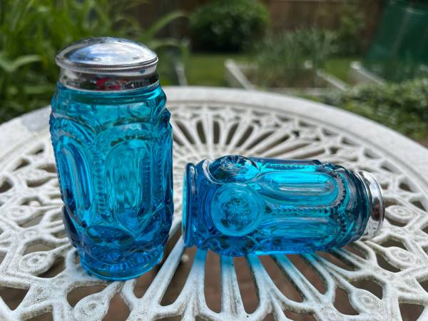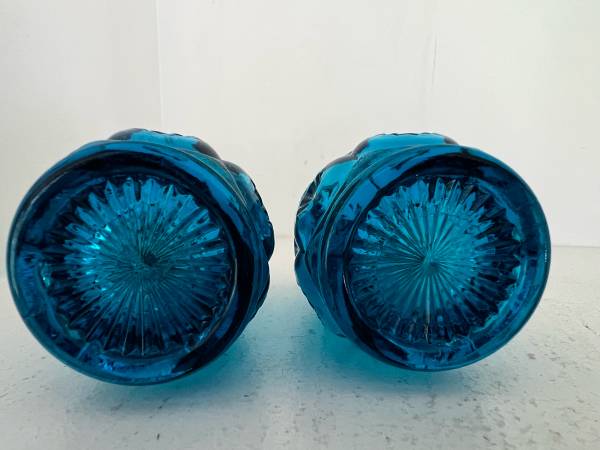 L.E. Smith Blue "Moon and Stars" Salt & Pepper Shakers. These shakers have a stunning color are in great condition. Vintage US glassmaker collectible.