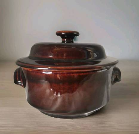 Lipton Dark Brown Glaze Baker 1 QT Round- Eyebrow Handles & Lid...