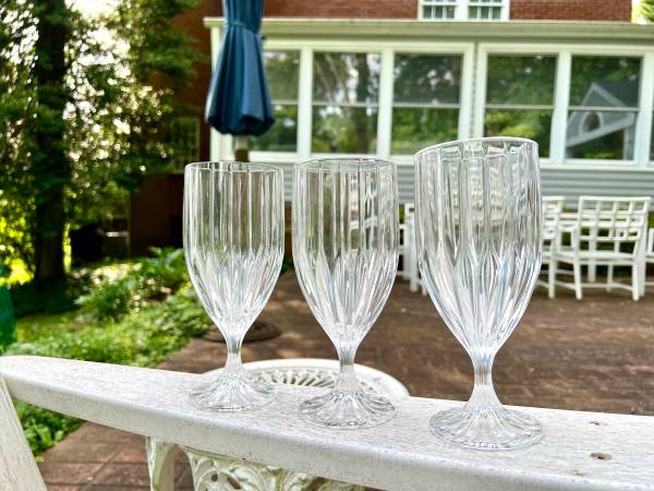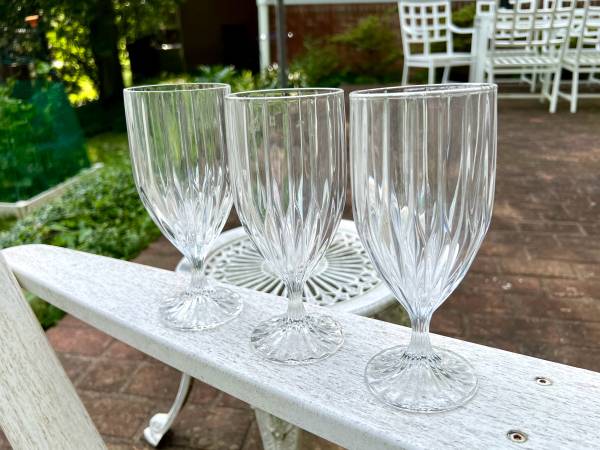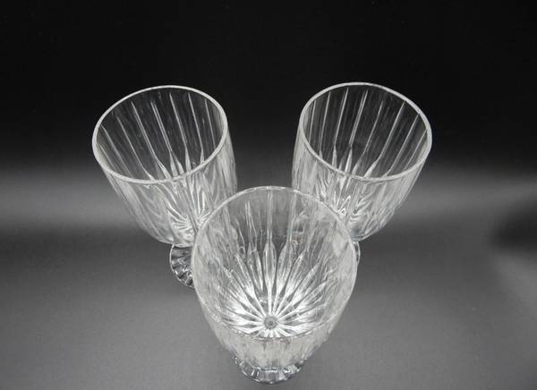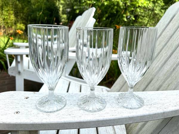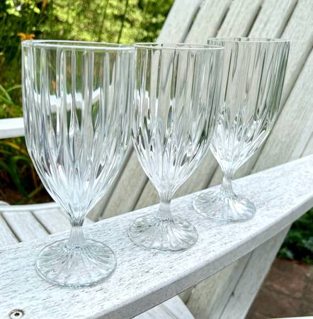 These are made in the Park Lane pattern, which was introduced in 1987 and produced through 2010. The pattern consists of a vertical cut design that extends from the foot base of the glass to the top of the bowl. Each glass is quite heavy and sturdy and is in excellent shape