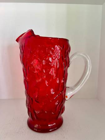 This is a Morgantown Seneca Driftwood Crinkle Red 10” tall Pitcher with Ice Lip. It holds 64 ounces. vintage American made glass - now discounted. On line prices are usually about double this price for this lovely pitcher