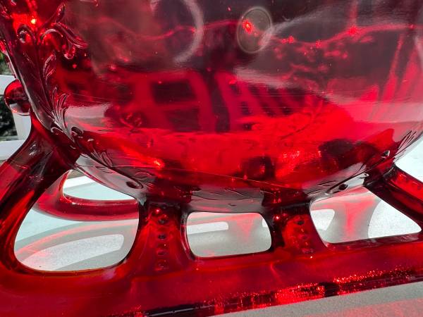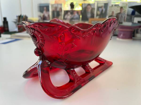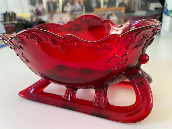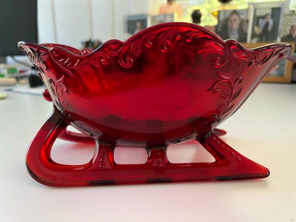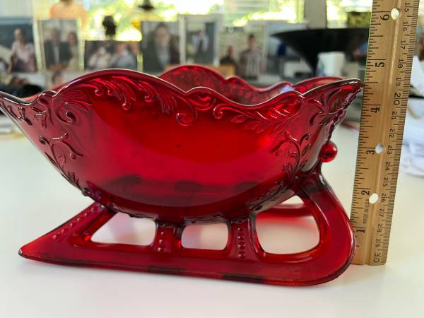 This Beautiful Ruby Red Sleigh measures approx. 9” long, 6” wide and 5" high. This deep sleigh is perfect as a centerpiece with Glass Holiday Bulbs, cookies, little presents, Desserts, flowers or Candy. This would even look sweet in a power room with soaps or finger towels.