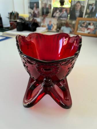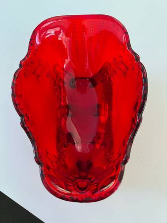 This is the old Westmoreland Glass sleigh pattern- it has a nice nostalgic feel. There is a hard to notice small defect in the glass where an odd line ( not a crack) appears probably from the manufacturing process ( see last photo) - this is a solid piece and can hold water for a flower arrangement perfectly