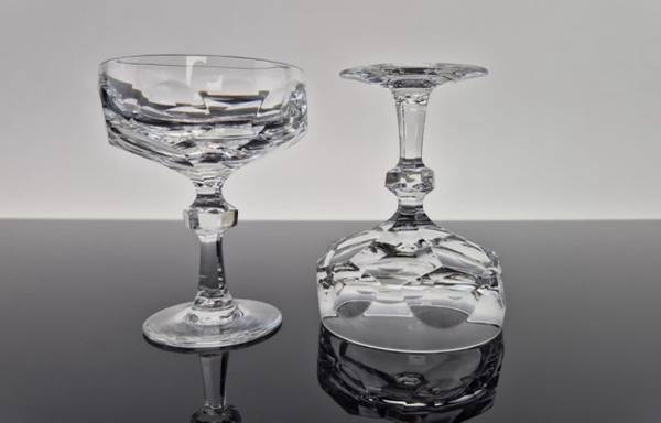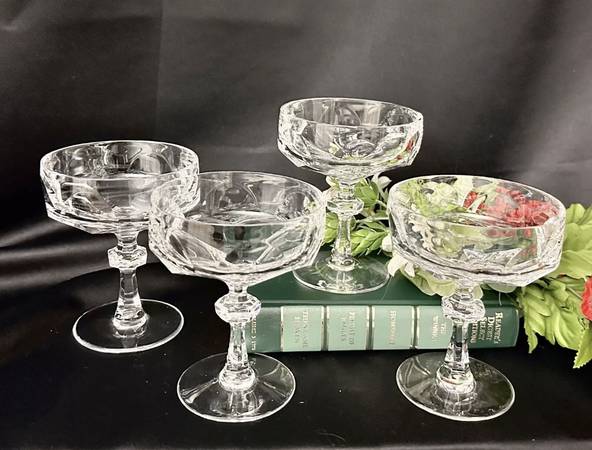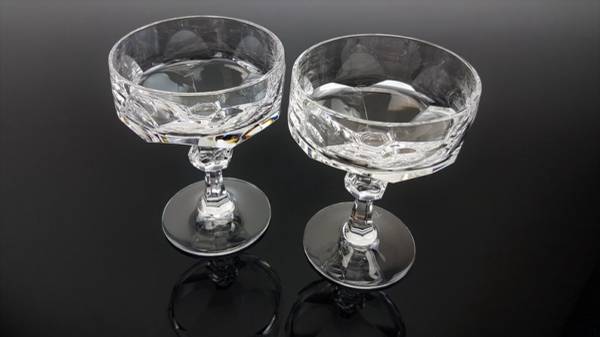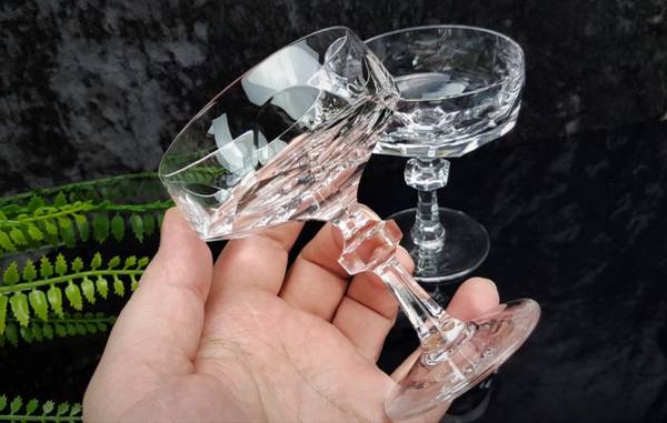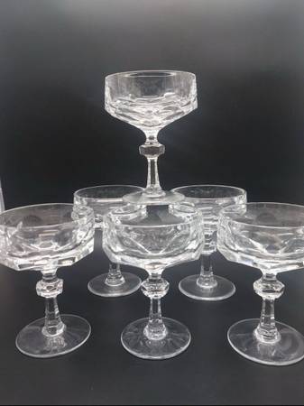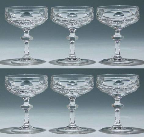 This is for a Set of 6 smaller Vintage Dessert Cups / Champagne or liqueur Coupes that are Blown Glass from Nachtmann. These glasses are in the Alexandra pattern and are Cut Blown Glass with panel cuts on the bowl. They have a multisided stem and a beautiful multi sided knob also in the stem.
