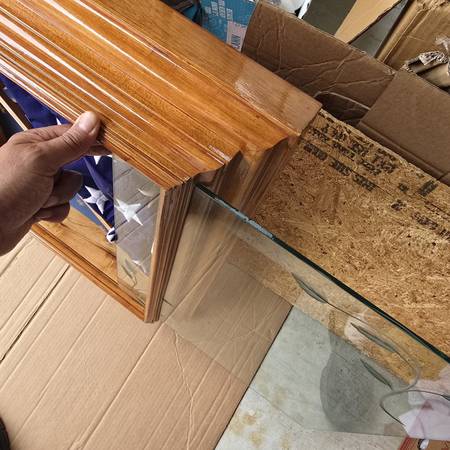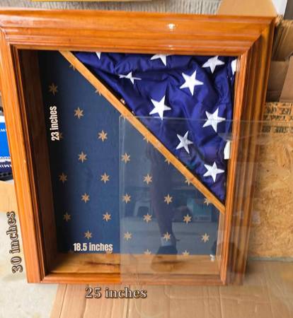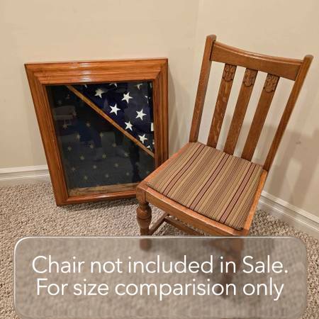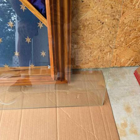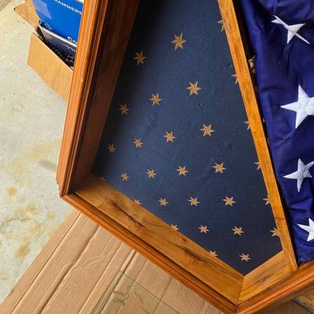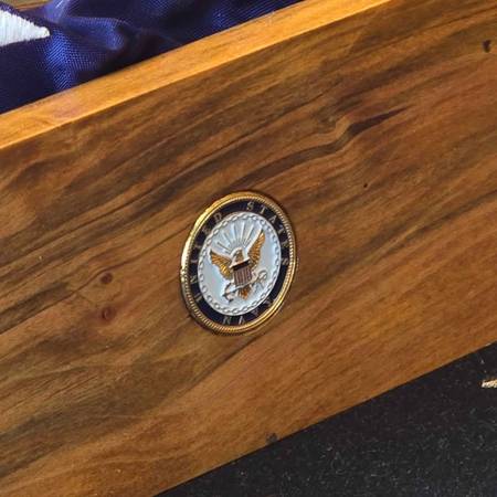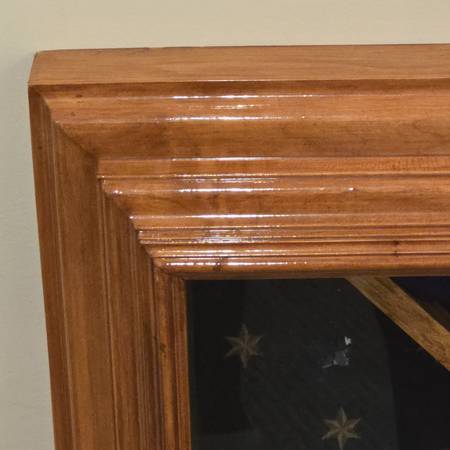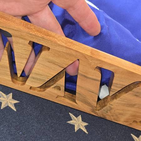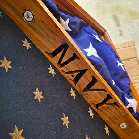 Hand-built custom, very unique display case with U.S. flag, perfect for emblems, ribbons, coins, uniforms, weapons, etc, to show off. Beautifully finished and crafted oak frame. "NAVY" cut out in divider between display area and flag (see pictures), includes 2 miniature Navy coins. Unique slide in/out heavy glass for ready installation and cleaning. Decorative leaf design etched/embossed on glass.