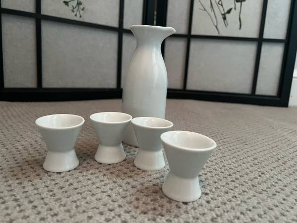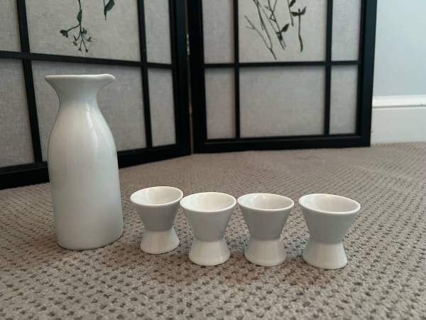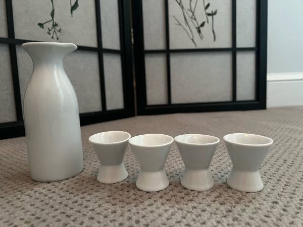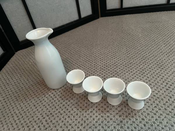 Charming set. The Carafe is from world market and the cups (with a classic shape and no markings) compliment the carafe well. Enjoy sake in true Japanese style with this set. Each piece is in excellent condition with no chips or cracks or discoloration.