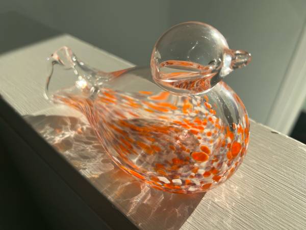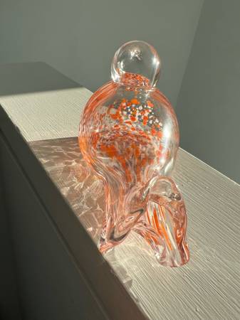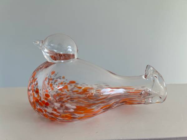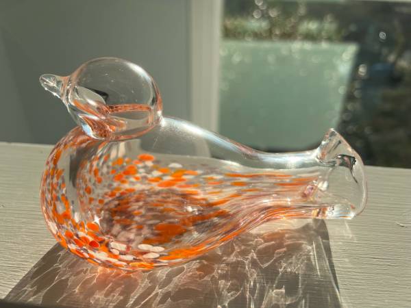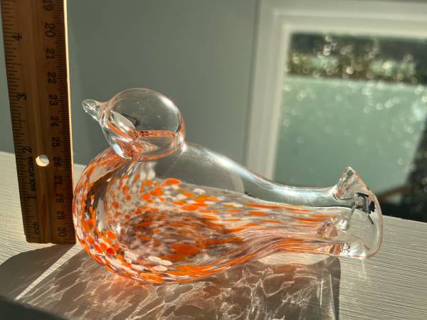 Handblown clear bird figurine with fused orange glass on the bottom. Hollow inside Bright and cheerful- just light sunshine! In excellent condition Dimensions: 6 inch long x 4 inch tall Pick up in...