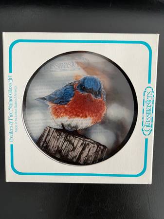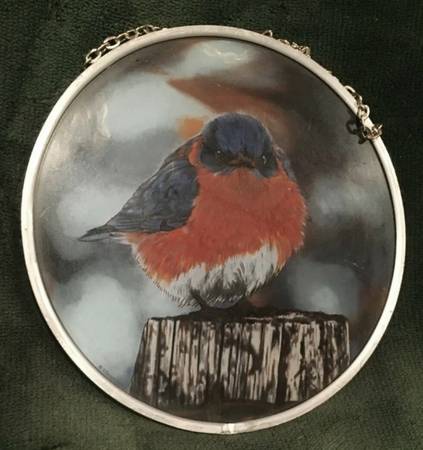 Add a touch of vintage charm to your decor with this beautiful stained glass sun catcher. Crafted by GLASSMASTERS in the USA in 1979, this piece features a stunning depiction of a Mad Bluebird. Measuring 6-3/8 inches in diameter and made with fused glassmaking technique, this suncatcher is sure to catch the eye of any visitor. The multicolor stained glass design and country-style make it a perfect addition to any
