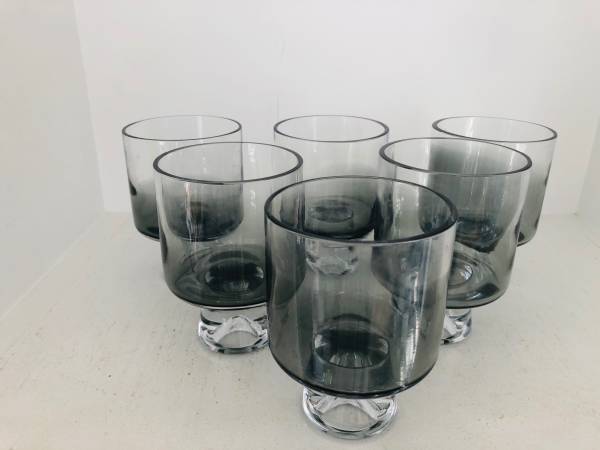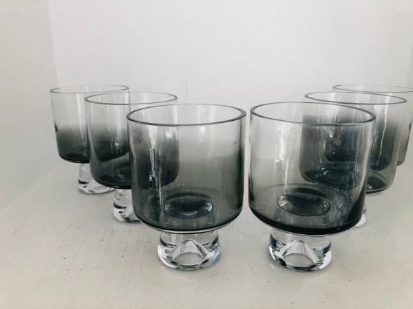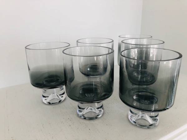 These glasses retail for $375 new. (See screenshot of tom Dixon website) The set is unique and quite stunning. The color of these glasse is considered black but these look grey with a fading effect to be darker at the base of the glass. The foot of each glass is clear. Each glass is in perfect condition. It's a FABULOUS set. Has a great mid century Modern (mcm) feel.