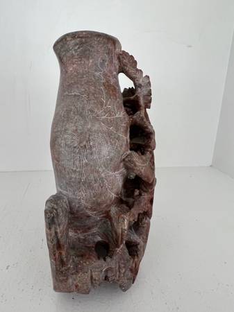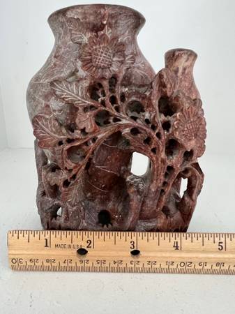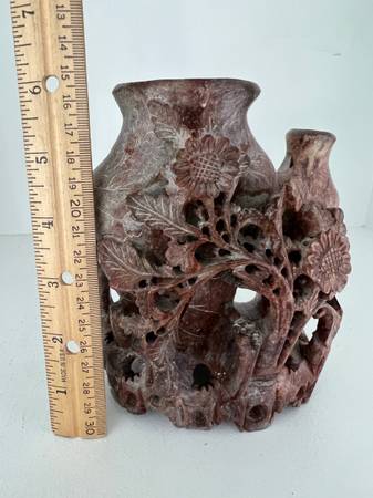 Rose Soap Stone Hand Carved Floral Pattern Vase. This beautiful vase is in rose soap stone and has been carved the the traditional way. The base was carved into the vase. This is an amazing vase and it displays very well. The amount of work that went into carving this vase is astonishing. Please look at the bottom front of the vase. The vines of the flowers are separate but attached to the vase. Notice the bottom and the inside of the vase. You can see the chisel marks. This vase is a little hard for me to give up, however it needs to go to a new home. Excellent Condition.