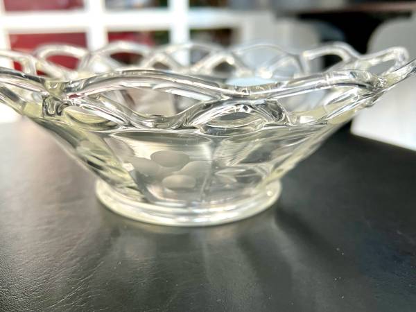 Really sweet clear bowl which is etched and finished with a lace trim edge, looks great on display and looks great on your table This is a wonderful low cost but high impact piece- great addition to...