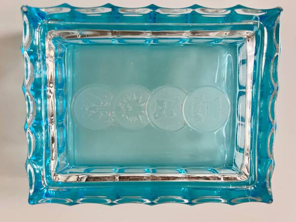 This is HARD to FIND antique - the box has a clear lid with 4 coins and a base in an Ice Blue color.