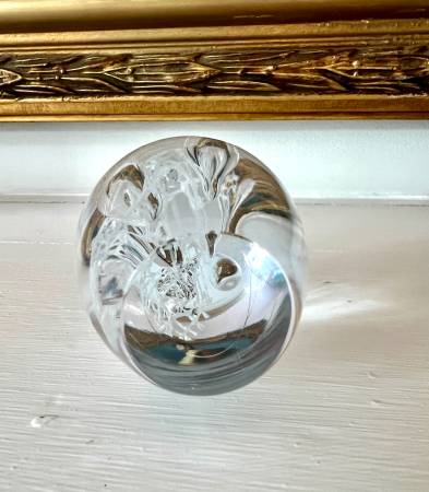 Vintage clear art glass paperweight with controlled elongated bubbles. Heavy and beautiful with a egg shaped form and a polished base. These are highly collectable pieces of art glass which absolutely glow in the light with beauty and grace.
