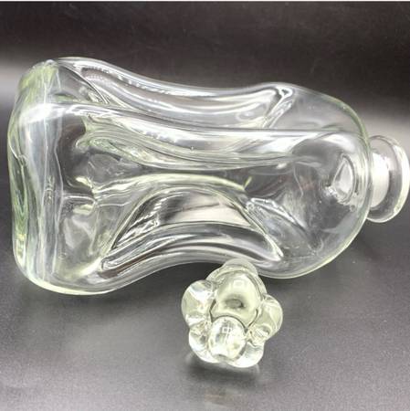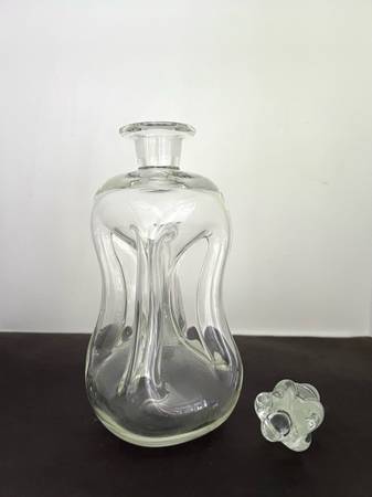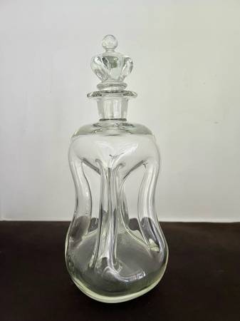This is a vintage hand blown Holmegaard clear art glass Kluk Kluk bottle or decanter that has a crown shaped stopper and a polished pontil. It has no makers marks. Hand blown glass, then the sides are pinched that creates the sound of kluging while being poured. Danish Glassworks Co.
