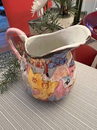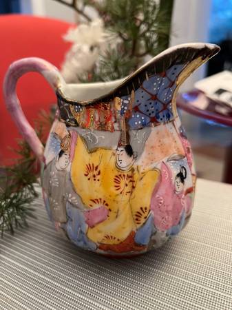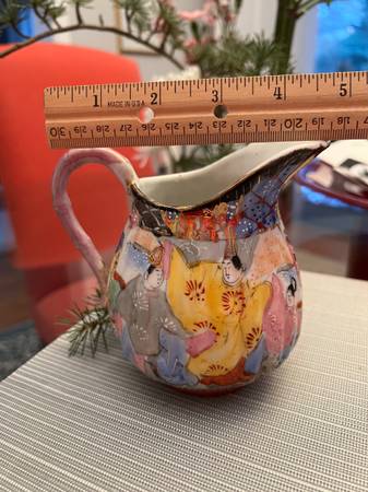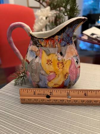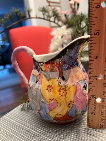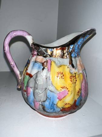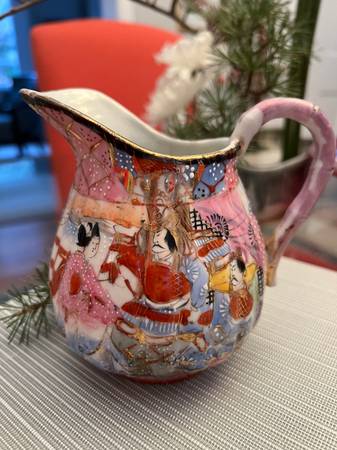 Wonderfully detailed pitcher with gold trim and a pink or mauve bamboo pattern handle. The porcelain has a translucent quality and is scalloped all around - the hand painted images are depicting various people and places. Gold Imari trim throughout. No chips or cracks or repairs