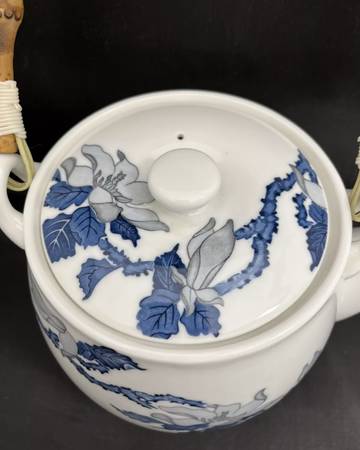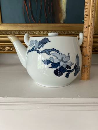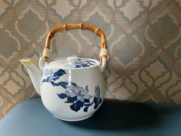 Simply lovely porcelain blue and white teapot with delicate flowers crafted in Japan. This is Mino Ware Toho Kiln Earthenware 1.5 Liters.