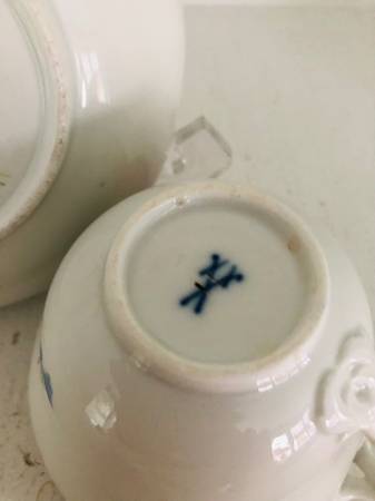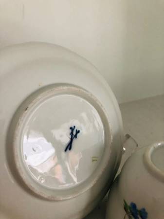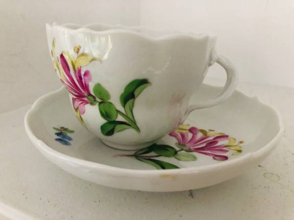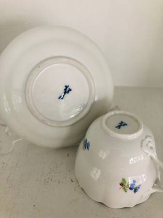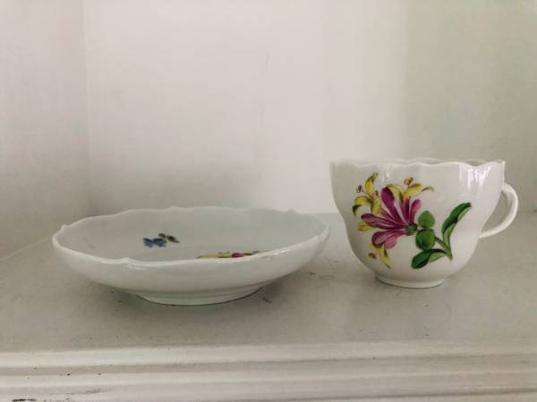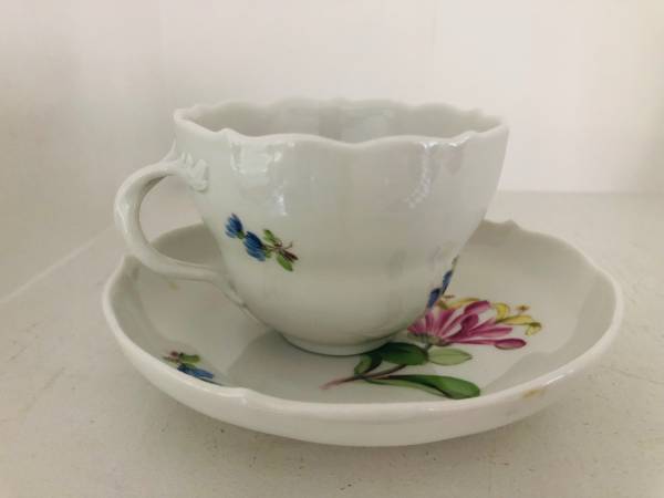 Beautiful set of Meissen teacup and saucer with hand painted flowers, most likely dated 19th, or early 20th century. The teacup and saucer feature scalloped rims and hand painted flowers over white porcelain. Both pieces show the Meissen blue under-glaze cross-swords logo . Notably, the Meissen cross-swords shown at the bottom have heavy endings at the tip of the handles, and from my research, a mark that appeared from 1815 to 1924 and helped dating the pieces.