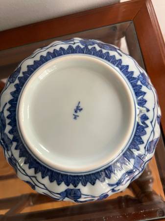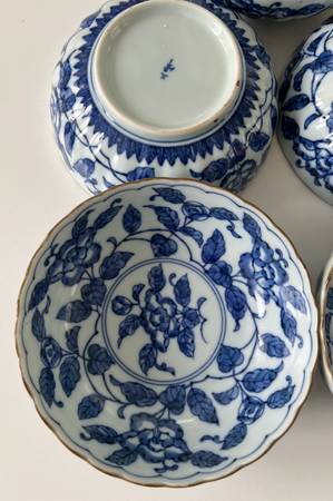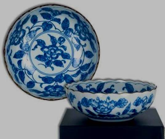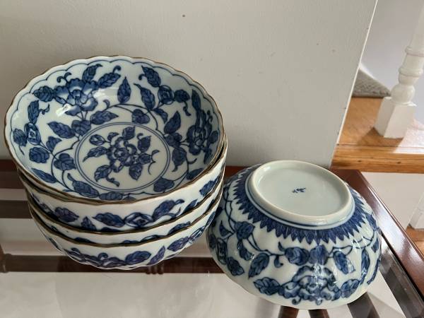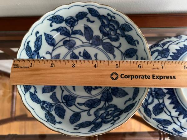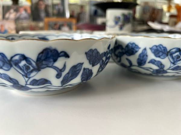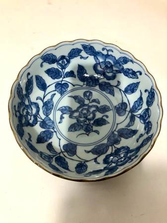 Beautiful Blue Floral Three Peaks Japanese scalloped edge blue and white porcelain bowls with brown trim. These are nice medium sized bowls and great for serving family style sides.