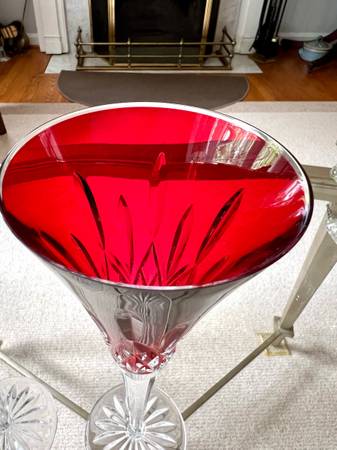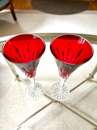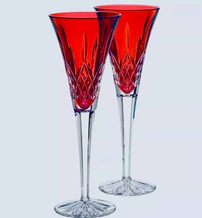 Two absolutely beautiful crystal champagne flutes from the LISMORE Collection. These were created by Waterford before they were bought out so they are original quality made in Ireland and have no defects or flaws. About the red crimson collection: The Waterford Lismore Crimson Collection is a seamless fusion of dramatic color and the brilliance and clarity of the classic Lismore pattern. This pair of Lismore Crimson Flutes enhance the aesthetics of sparkling wine and cocktails, while showcasing the bold color of the Crimson Collection through the intricate detailing of Lismore's signature diamond and wedge cuts. Hand blown, handmade. Discontinued. Perfect vintage condition. Immaculate craftsmanship. These are real conversation pieces.