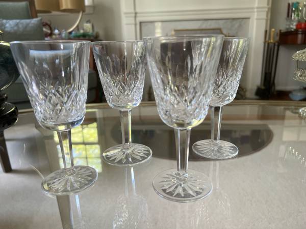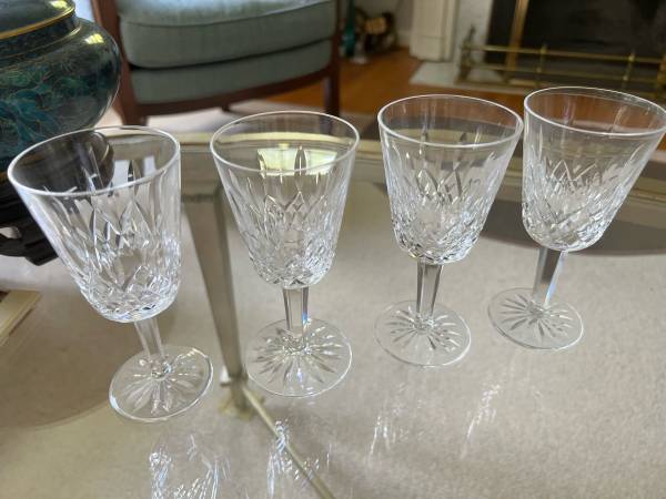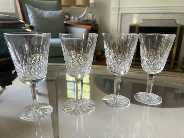 Stunning Vintage Waterford Lismore White Wine cut crystal glasses - all in chip free condition. These are the older Waterford Crystal Pieces from Ireland. Each piece is really quite stunning. Each waterford lismore glass features cross-hatch and vertical cuts to the bowls with multi sided stems and round bases accented with a starburst. Of all the Waterford Crystal Cuts, Lismore is the most loved and it continues to add grace and beauty to any home.