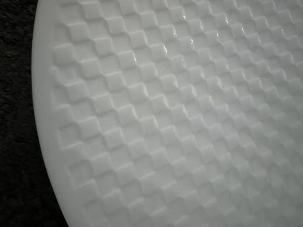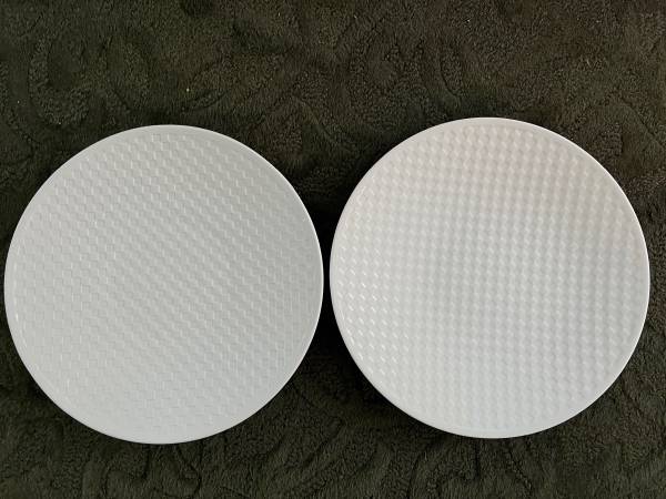 For either night or day, this white, bone china pattern is appropriate and eye-catching in its simplicity. The sophistication of pure white is combined with a bold checkered embossed design. This platter is the perfect complement to a range of table settings. Each plate in perfect condition with no chips, cracks or utensil marks. Microwave Safe, Dishwasher Safe.