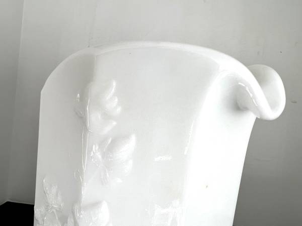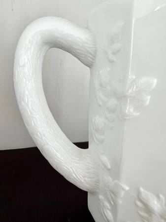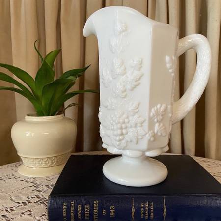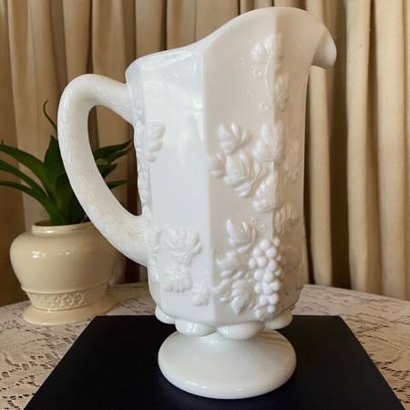 A nice sturdy and elegant milk glass beverage/water pitcher by Westmoreland in their paneled grape pattern. It is in excellent condition with no chips or cracks.
