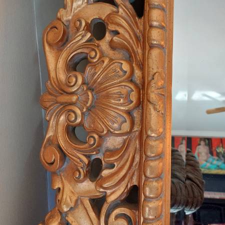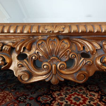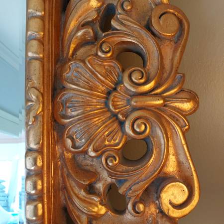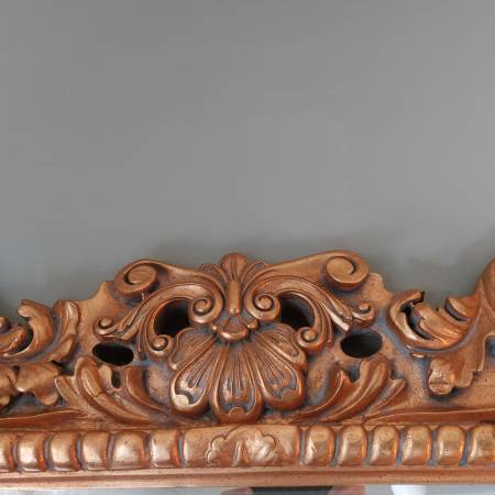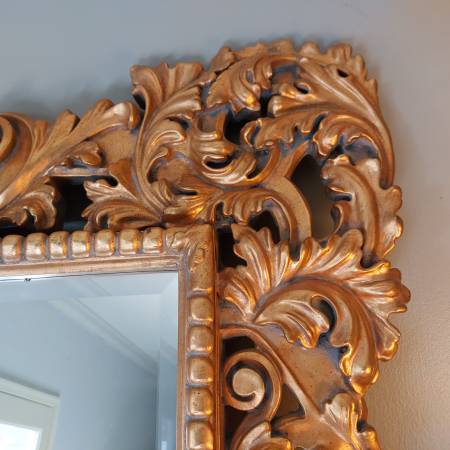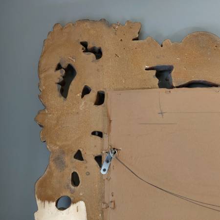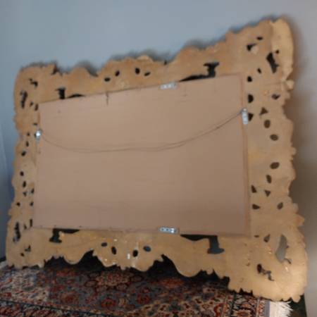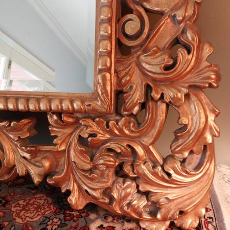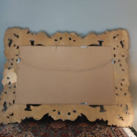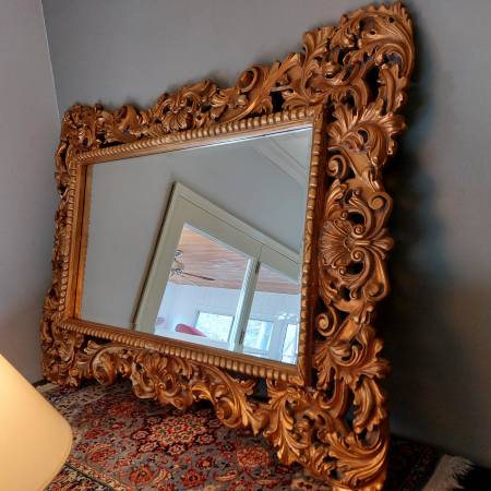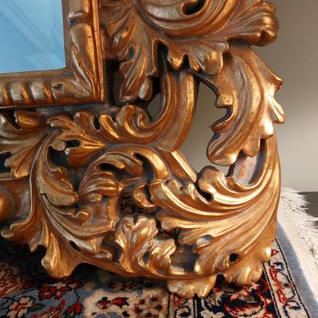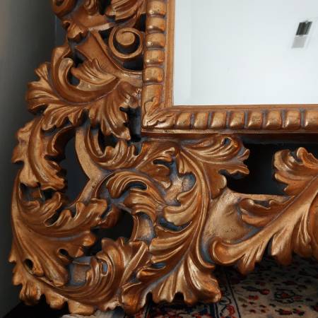 Probably French or Italian, this large mirror can be hung either horizontally or vertically, being carved in the same way all around the perimeter; making it suitable for a variety of settings, including as a pier mirror or overmantel. Bold and three dimensional scrolling elements meander around the frame, some invoking leaf forms, others more evocative of strapwork and cartouches. The gilding is bright and very attractive on a thick gesso ground. Ca. Mid 20th century. There is some patina and wear, typical sporadic chipping and some spots of retouch, all in all a good surface with attractive signs of age. Mirror plate with some irregularities, light desilvering.