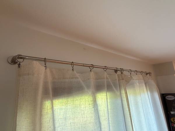 ($30 ea set) CURTAINS/ UV SHEERS, rods and rings; 1 pair new in pkg. 2 pair are in use, at $20ea. Incl clip-on style rings, and wraparound CURTAIN RODS. Each panel 50”W x 84”H SELLING bc house is...