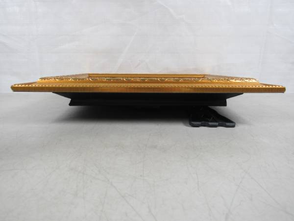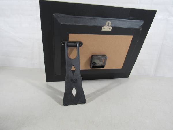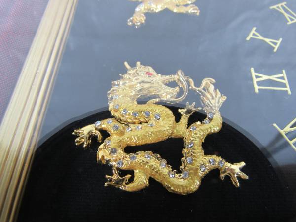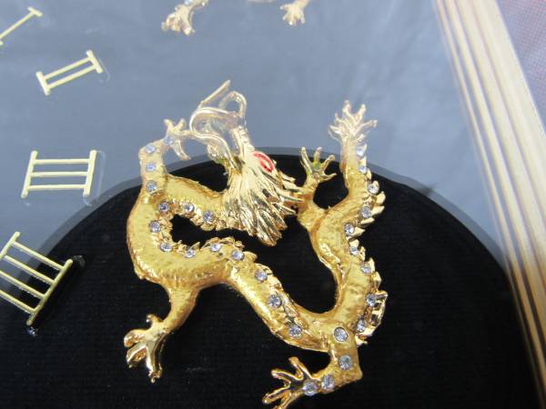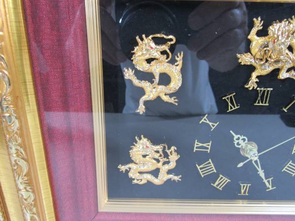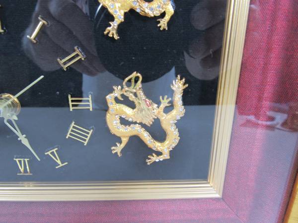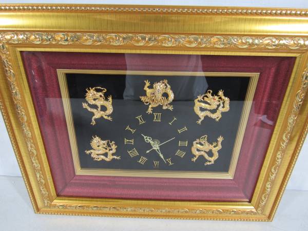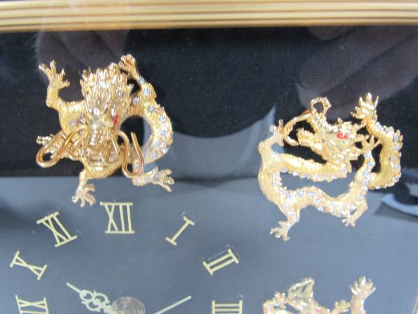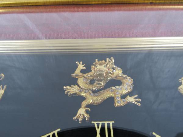 The clock is 15" X 12". The frame is a gold colored wood, and the lens is glass. I am not sure what the Dragon figures are made of. Possibly brass or brass plated metal with small jewels on each them. Clock can be wall mounted or placed on a table or other flat surfaces. Very good working and cosmetic condition. Uses one "AA" battery which is not included. No broken or missing parts.