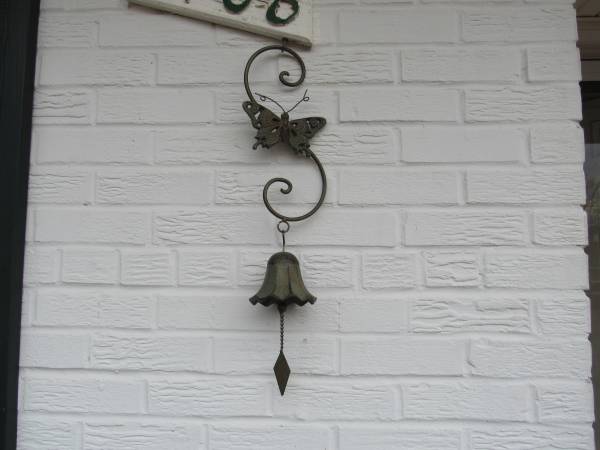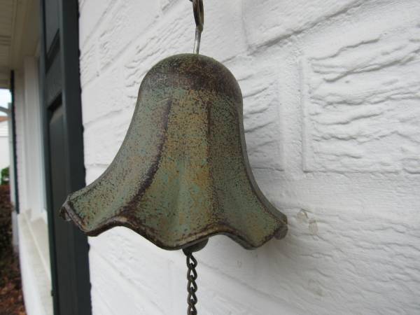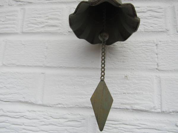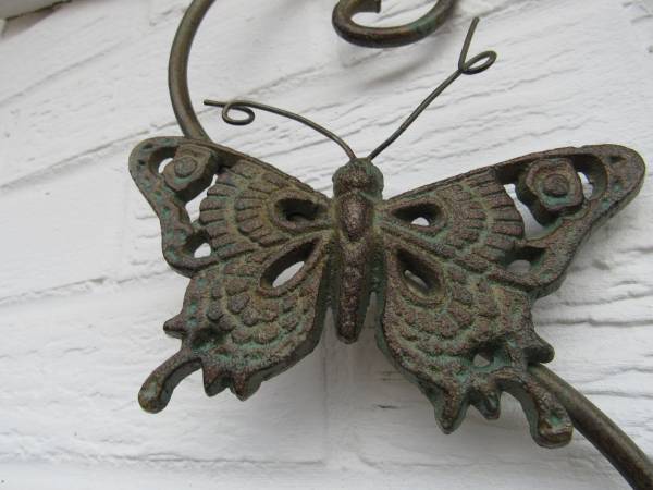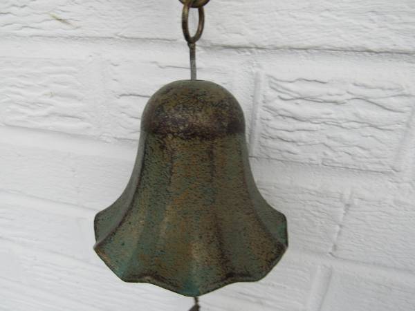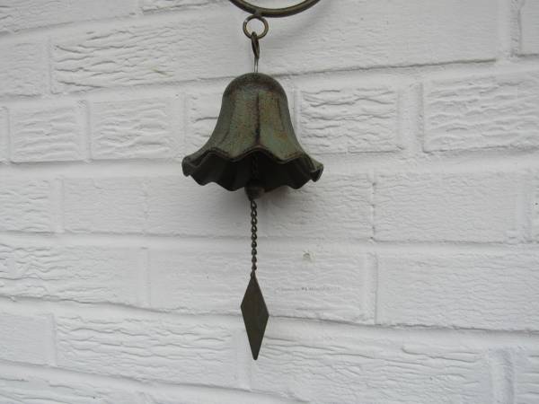 The Windchime is 22 1/4" tall. The bell is 3" tall X 4 1/8" bottom diameter. The butterfly wingspan is 5 5/8". Made of wrought iron with a sea green gold tone mix finish. Weighs 2 pounds approximately. Good condition with some minor age and usage wear. No broken or missing parts.