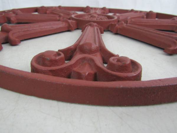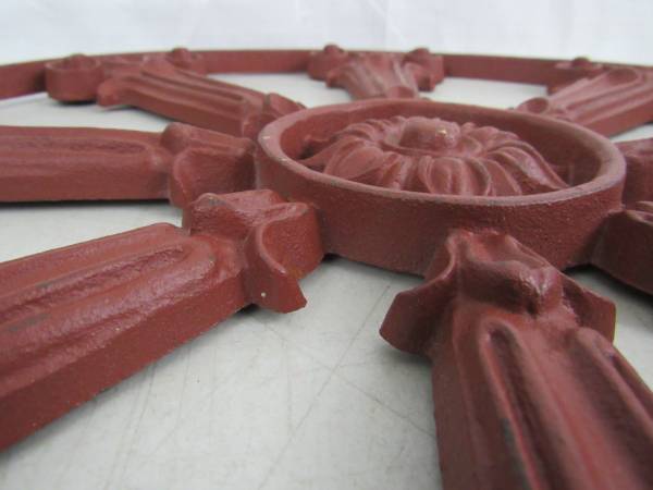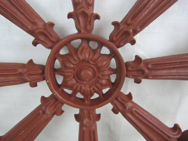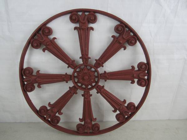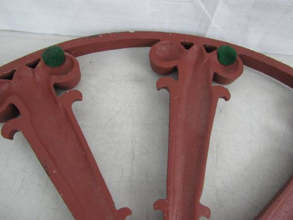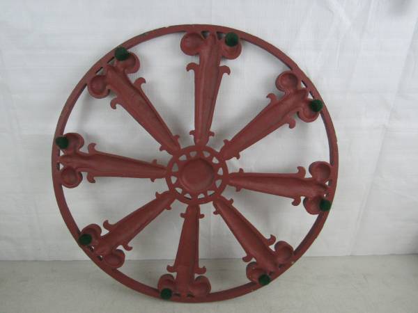 The wheel is 17 1/2" diameter X 5/8", and weighs 11 pounds 11 ounces. Was only used on the inside as a decor item. Good condition with some minor usage wear. No broken or missing parts. See photo's