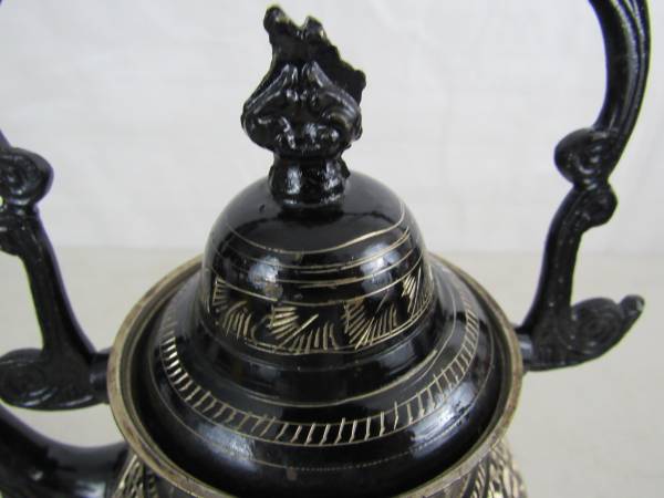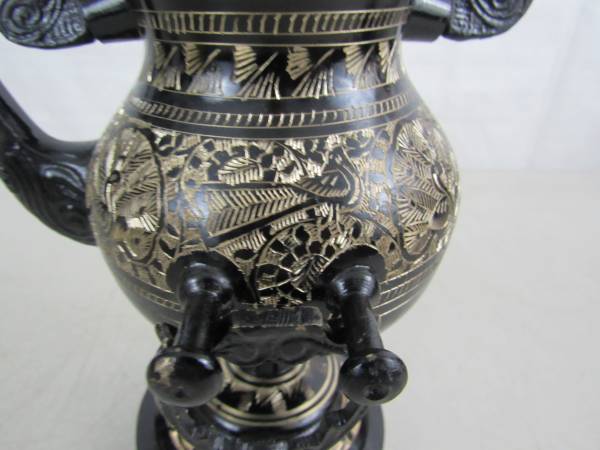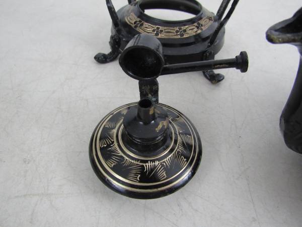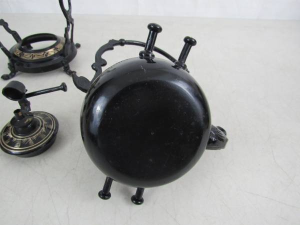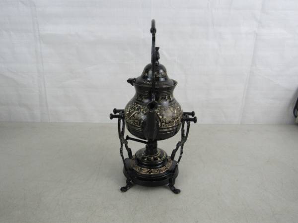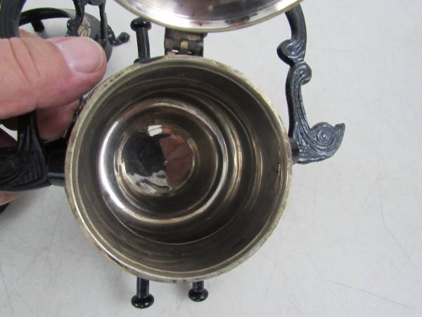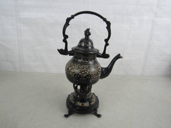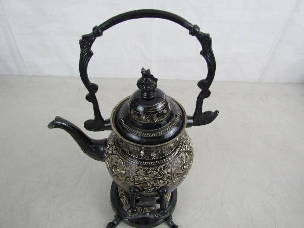 The tea pot with stand is 11" height. Made of brass that has been painted. Holds 16 ounces of liquid. The inside of the tea pot is either chrome plated or silver plated. There is no wick or fluid included for the inside of the warmer. The cap to the warmer has been cross threaded but still attaches firmly. Good condition with some minor age and usage wear.